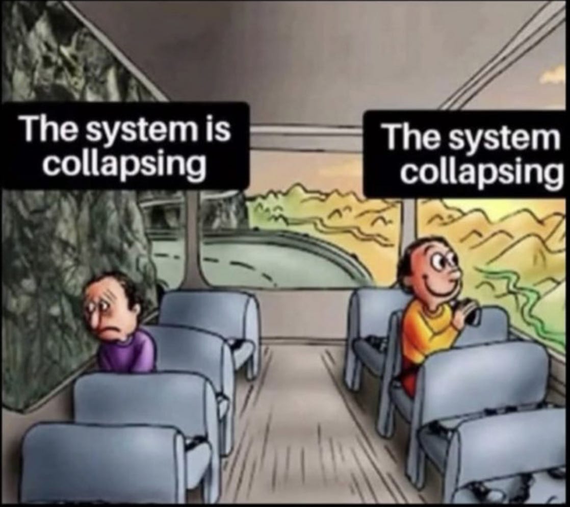 If we’re addicted to our screens and being programmed by whatever “they” want us to see and believe, then we’ll be reacting with horror right now that the whole system seems to be collapsing. But if we understand that’s what’s breaking down has been broken for a long time, then we’ll be delighted that the system is collapsing. Why would we want to sustain corruption and deceit and war forever, just because it’s presented by handsome leaders with nice hair?