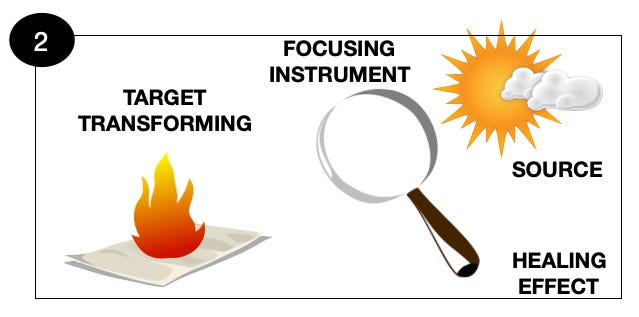 There are four components here: Source, Instrument, Target, and Effect. Source is the power of Life, active in you as long as you live. Instrument is your body/mind/heart. Target is someone you love. Effect is a healing influence.