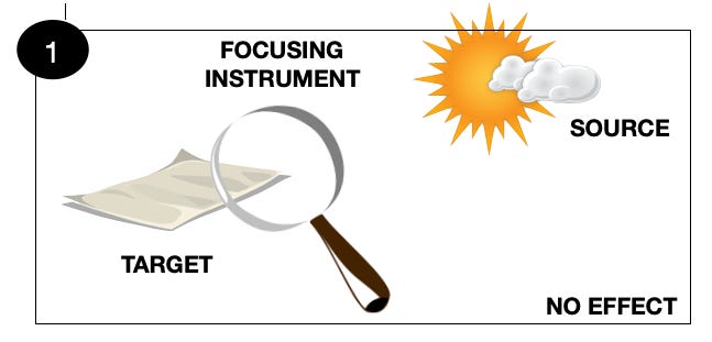 This crude rendering depicts a magnifying glass being held over a piece of paper on a sunny day. There is no effect. Now, in the second image below, the magnifying glass has been moved away from the paper. At the correct focal point, the rays of the sun concentrate precisely on the paper and it bursts into flames.
