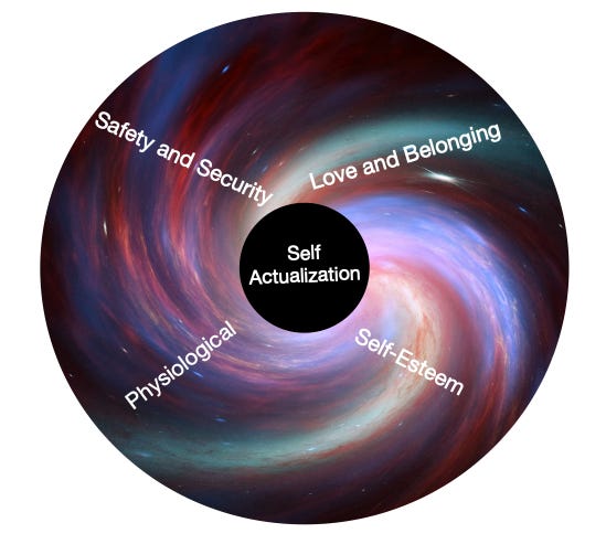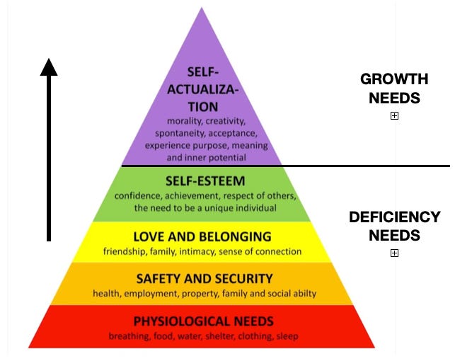 Maslow prioritized the bottom four, although he admitted they didn’t need to be fulfilled 100% before proceeding up to the growth needs. I’d go further: why arrange these as a hierarchy at all? Yes, the physical needs are more urgent - food, shelter, security, etc. - but it’s fair to suggest that we (humans) are now suffering from a chronic deficiency of what Maslow called Self Actualization and what I would simply call knowing ourselves. This now seems at least as (concurrently) important.