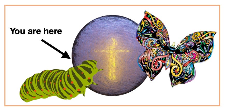 The problem with the real one - captured in the caterpillar to butterfly metaphor - is timing and convenience. The human version of that transformation is a messy, drawn out process, not especially enjoyable. Plus, it seems so theoretical, so ethereal, while our real-life challenges are … real. Who can really put their faith in that metaphor when the economy is crashing, prices are sky high, our jobs may be threatened, the climate is changing, wars are raging, gender dysphoria is exploding, virus are mutating, we don’t feel so good, and shadowy elites are plotting the replacement of humans with cyborgs… yikes! Our best response is to sit and meditate and hope to fly … someday? Really?